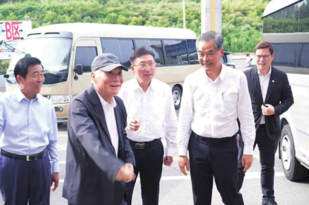 曹董與李寧在報紙機前合影。開業剪彩現場。...